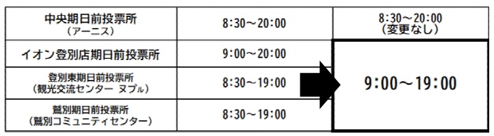 当日投票所・期日前投票所の開閉時刻の見直しを検討します。