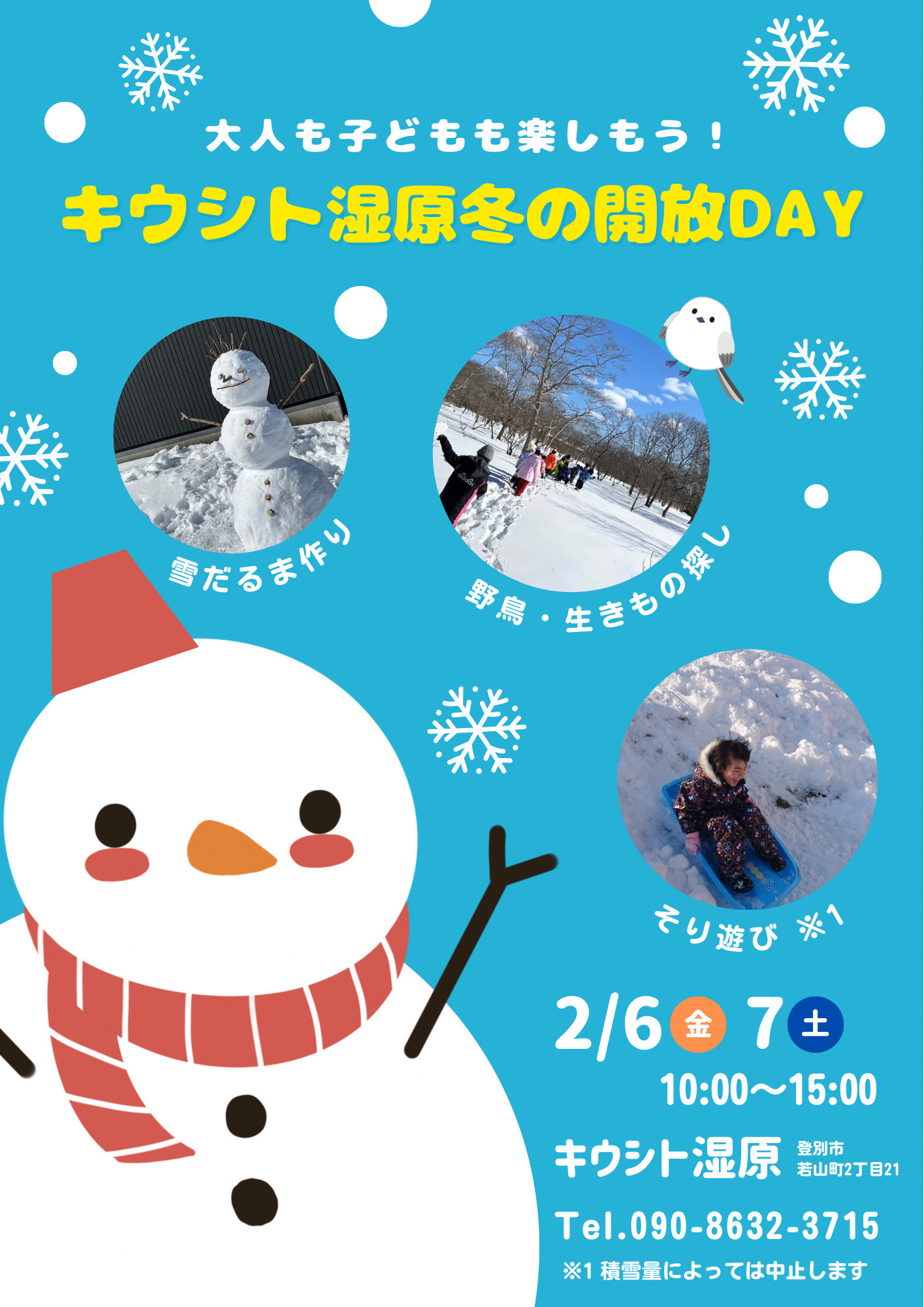 公開日 2026年01月06日 日時 2月6日(金)・7日(土)10時~15時 場所 キウシト湿原 イベント内容 ①雪だるま作り ②野鳥・生きもの探し ③そり遊び ※降雪量が少ない場合、中止することがあります。 問い合わせ 都市整備部 土木・公園グループ(公園担当)TEL:0143-85-4115FAX:0143-85-8286E-Mail:kouen@city.noboribetsu.lg.jp