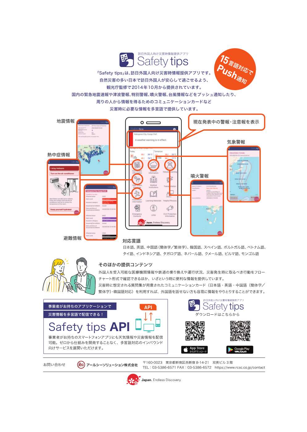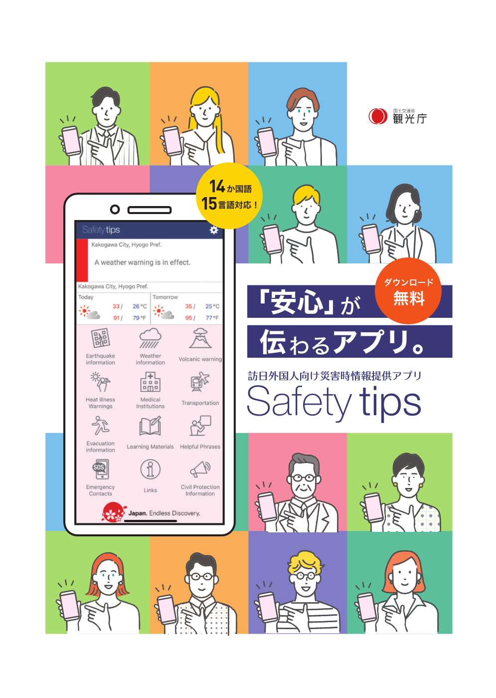 「Safety tips」は、自然災害の多い日本において、訪日外国人が安全に観光できることを目的とし、観光庁監修のもと開発されたプッシュ型情報発信アプリです。