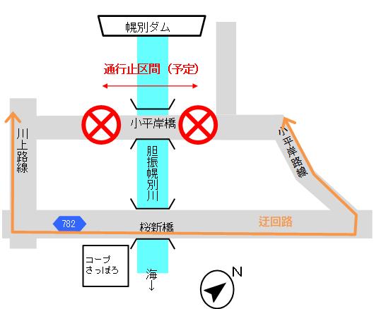 公開日 2025年12月10日 1.路線名 市道小平岸路線 小平岸橋付近(新川町3丁目21-2地先) 2.期間 令和8年1月中旬~3月下旬 ※工事の進捗により変更になる場合があります。 3.通行止め理由 橋梁補修工事のため 問い合わせ 都市整備部 土木・公園グループ(土木/施設維持担当)TEL:0143-85-3260FAX:0143-85-8286E-Mail:doboku@city.noboribetsu.lg.jp