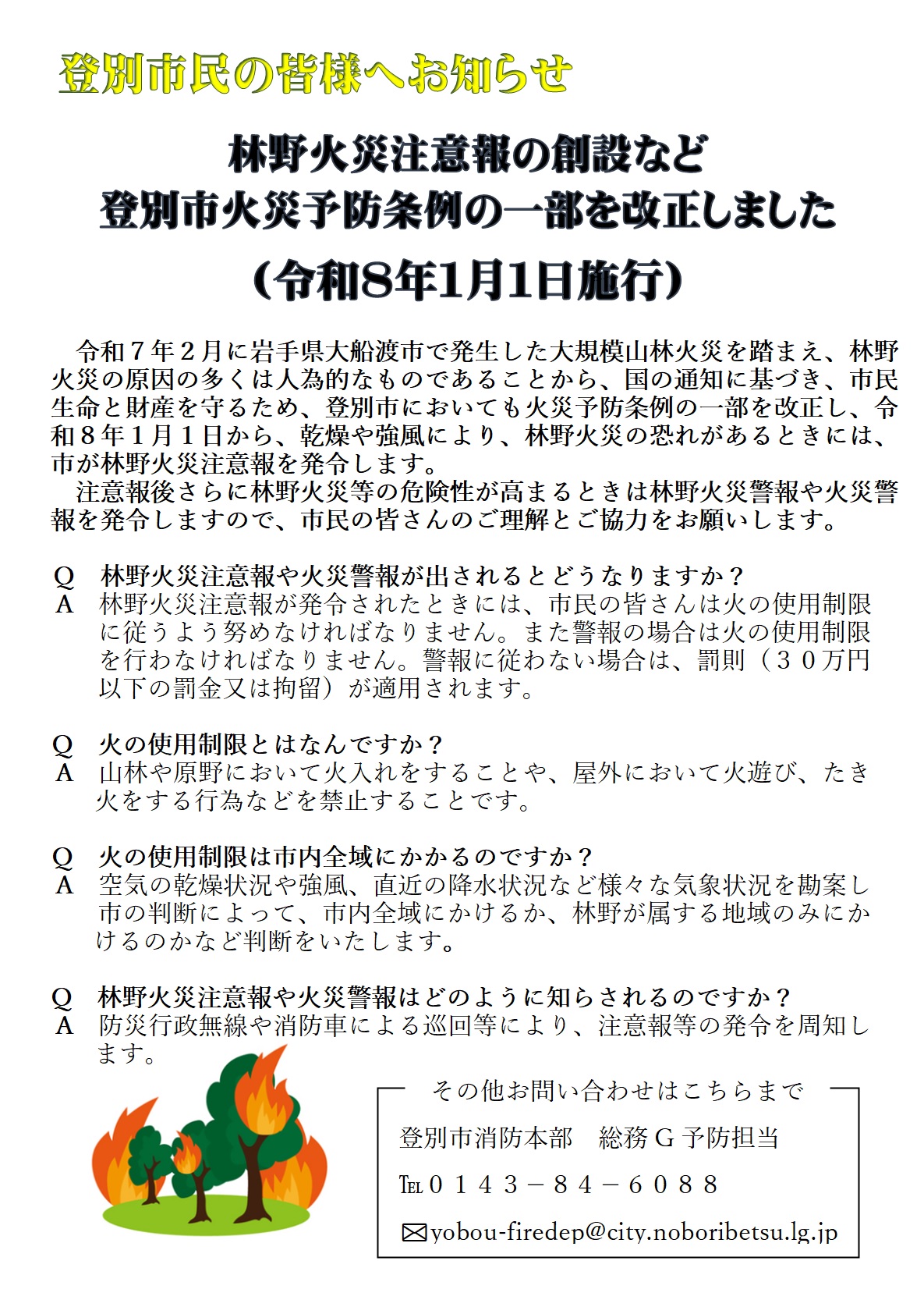 公開日 2025年12月26日 令和7年2月に発生した岩手県大船渡市の大規模林野火災を踏まえ、国の通知に基づき登別市火災予防条例の一部を改正し、令和7年12月12日に公布しました。 これにより、令和8年1月1日から、市が乾燥や強風の気象状況から判断し、林野火災注意報や林野火災警報を発令します。 発令した場合は、防災無線や消防車の広報などにより市民の皆様へ周知します。対象地域における屋外でのたき火や花火などの中止をお願いしますので、ご理解とご協力をお願いします。