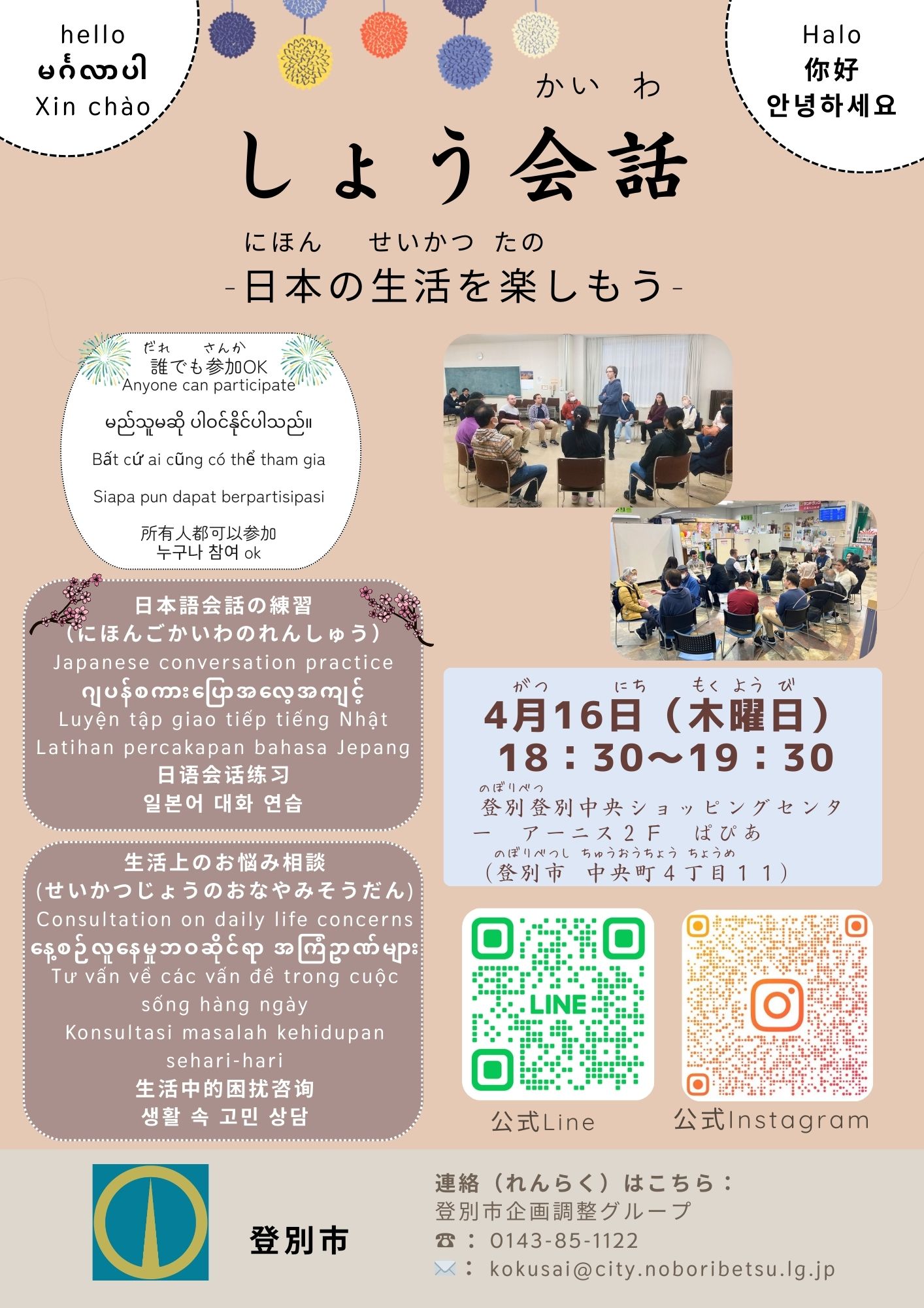 外国人も、日本人も、大歓迎(かんげい)です。ぜひ来(き)てください。まず小(ちい)さい会話(かいわ)からはじめましょう。