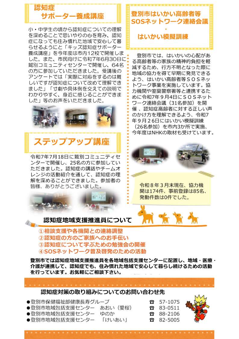 登別市と地域包括支援センターあおい(愛桜)・ゆのか・「けいあい」との共同発行で、登別市の認知症地域支援推進員が行った活動を中心に掲載しております。