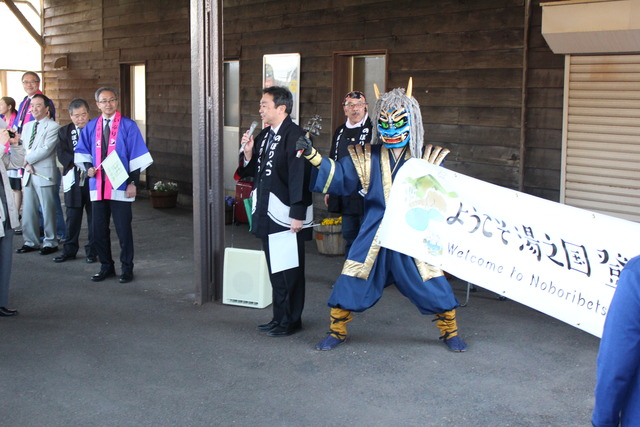 その後、乗客はJR登別駅で専用バスに乗り換え、「登別漁港」で湯鬼神による催し物を見学したほか、「わかさいも本舗登別東店」で登別近海の海の幸を堪能してもらい、宿泊地である登別温泉に向かわれました。